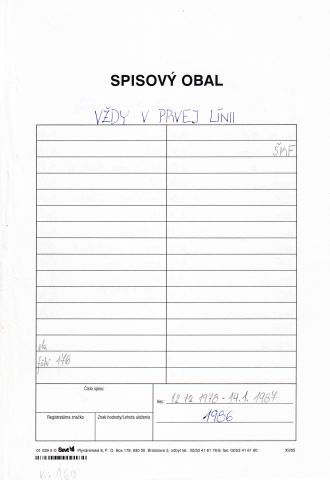 - zmluva na vypracovanie odbornej literárnej predlohy (1 ks) zmluva na vypracovanie námetu (1 ks) zmluva na vypracovanie scenára (6 ks) návrh na výplatu honoráru (4 ks) odborná literárna príprava filmu (1 ks) námet filmu (2 ks) scenár filmu (3 ks) hodnotenie námetu a/alebo scenára filmu (8 ks) sprievodka výroby filmu (1 ks) rozpočet filmu (1 ks) zmluva o umelecké dielo (2 ks) realizačná zmluva s výrobným štábom (1 ks) dohoda o vykonaní práce (2 ks) dohoda o vytvorení hereckej úlohy vo filme (4 ks) denná správa o realizácii filmu (16 ks) protokol o schválení servisnej kópie (1 ks) titulková listina filmu (4 ks) komentár filmu (3 ks) hlásenie o použitej hudbe vo filme (1 ks) súhrnná správa finišu (1 ks) protokol o schválení dvojpásu (2 ks) výrobný list (2 ks) dodací list o výrobe kombinovaných kópii z filmových laboratórií (3 ks) potvrdenie o prevzatí filmu distributérom (1 ks) zúčtovanie filmovej suroviny (1 ks) zúčtovanie filmu (1 ks) zápis z pracovnej porady (1 ks) korešpondencia (6 ks) iné (4 ks)