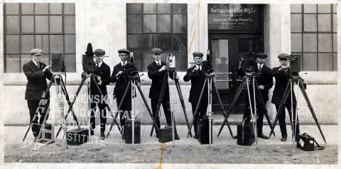 Na zadnej strane fotografie rukopisne uvedené: Kamery firmy Rothacker, asi 1918. Zľava: Šustekova (Selig Standard Camera), Pathé, Bell a Howel, chicagská, Bell a Howel, Pathé, Šustekova.