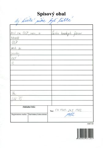 zmluva na vypracovanie odbornej literárnej predlohy (1 ks) zmluva na vypracovanie námetu (1 ks) zmluva na vypracovanie scenára (1 ks) návrh na výplatu honoráru (2 ks) odborná literárna príprava filmu (3 ks) technický scenár filmu (2 ks) hodnotenie námetu a/alebo scenára filmu (1 ks) komentár filmu (2 ks) výrobný list (1 ks)