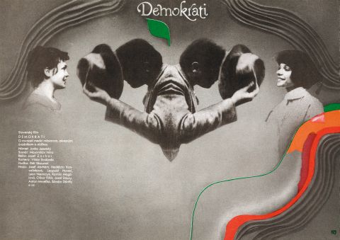 - Plagát k filmu: Demokrati (1980). Zobrazenie: koláž, muž s klobúkom v ruke zdraviaci ženy (Naďa Konvalinková a Kamila Magálová), záber muža je zrkadlovo zdvojený.