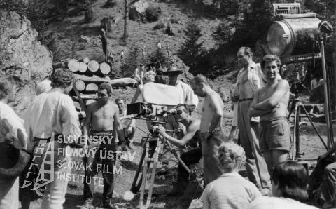 Druhý zľava stojí herec Vojtech Brázdovič, za kamerou sedí kameraman Vladimír Ješina, vpravo v pozadí v rozhalenej košeli stojí režisér Paľo Bielik, ostatní z filmového štábu (?)