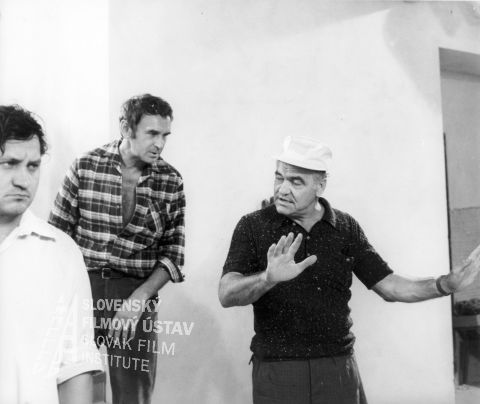 Vľavo stojí asistent kamery Martin Gazík, v strede stojí herec Svatopluk Matyáš a vpravo stojí režisér Andrej Lettrich