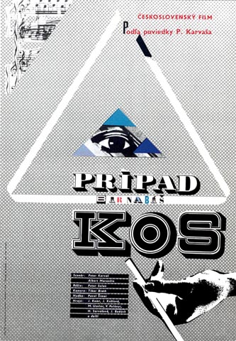- Plagát k filmu: Prípad Barnabáš Kos (1964). Zobrazenie: koláž, hudobný nástroj triangel, časť hudobnej partitúry, ľudské oko, ruka, sivé bodkované pozadie.