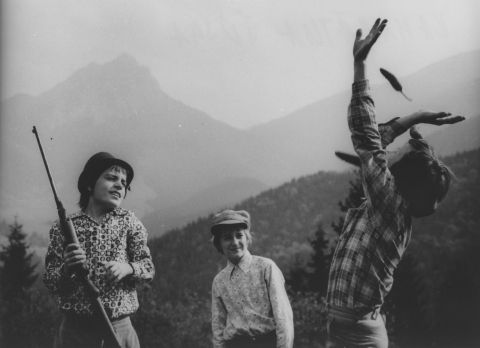Vľavo stojí so zbraňou v ruke Matej Landl (Ondrej Hronec), v strede stojí Andrej Kraus (Peter Horský) a vpravo stojí chlapec, na ktorého zhora padajú borovicové šišky