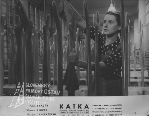 Distribučná fotografia z filmu Katka (1949). V popredí z umelých nôh strháva pančuchy Božena Obrová (Katka Jakubová).