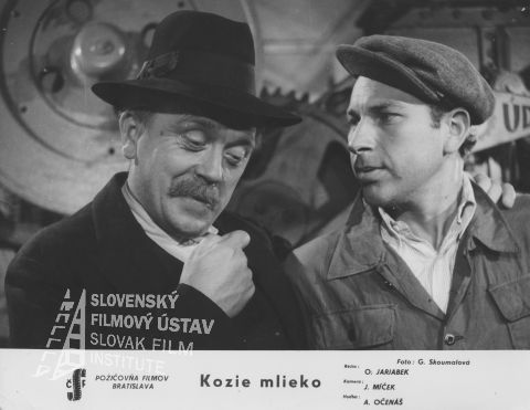 - Distribučná fotografia filmu Kozie mlieko (1950). Vľavo stojí Ondrej Jariabek (Ondro Dvorčiak) a vpravo stojí Ctibor Filčík (Peter Dvorčiak).