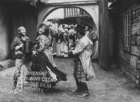 V popredí vo dvore hrajú a spievajú traja muzikanti: vľavo Václav Koubek (harmonikár), v strede Iva Bittová (huslistka) a vpravo (?), v pozadí prihliadajúci dav