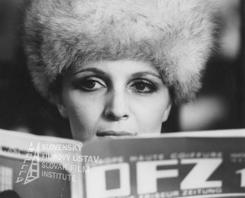 - Za časopisom s kožušinovou čiapkou na hlave Regina Rázlová (Adela)