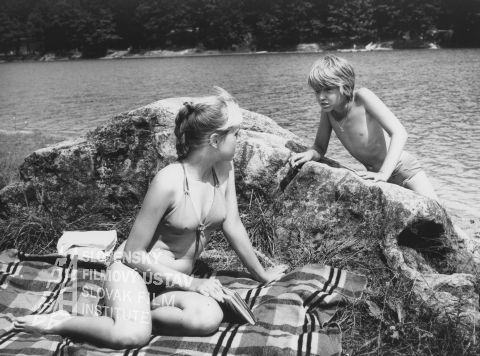 - Na brehu rieky na deke sedí s knihou v ruke Michaela Dudová (Valika Kováčová), vpravo stojí Richard Stanke (Peter Kováč, Valikin brat), obaja sú v plavkách