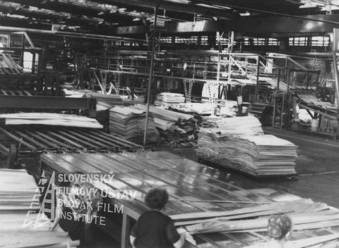 - Vpredu sú tri pracovníčky (jednej vidno iba hlavu), všade okolo nich je spracované drevo, stroje a bežiace pásy