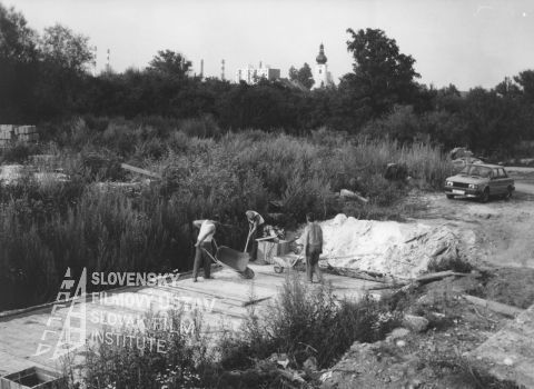 - V strede sú traja muži pri práci, dvaja tlačia fúrik, tretí má v ruke lopatu, vpravo je zaparkované auto, v pozadí vidno stromy, komíny z továrne, paneláky a kostolnú vežu
