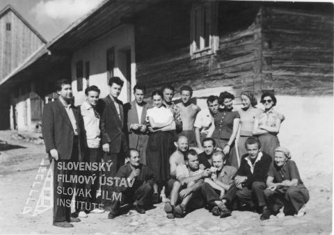 umelý názov dodaný katalogizátorom: [Herec Ján Bzdúch, asistent réžie Svätopluk Šablatúra, osvetľovač B. Bachratý, herečka Alžbeta Poničanová, hlavný osvetľovač Matej Krnáč, Ján Bachratý, Ambróz Serina, skriptka Graciana Hodníková-Vajcíková, klapka Alica Topoľská, H. Királyová, Jozef Hubiňák, maskér Michal Jurkovič a herečka Frída Bachletová