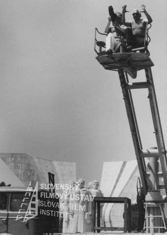 Pri nakrúcaní vo výške na plošinke sedí režisér Vladimír Kavčiak (drží kameru) a kameraman Viktor Svoboda (rukami gestikuluje)