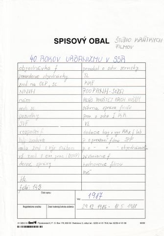 - objednávka filmu (2 ks) potvrdenie objednávky filmu (1 ks) zmluva na vypracovanie scenára (2 ks) návrh na výplatu honoráru (2 ks) scenár filmu (3 ks) hodnotenie námetu a/alebo scenára filmu (3 ks) sprievodka výroby filmu (1 ks) pracovný plán výroby filmu (1 ks) rozpočet filmu (1 ks) realizačná zmluva s výrobným štábom (1 ks) dohoda o vykonaní práce (1 ks) dohoda o vytvorení hereckej úlohy vo filme ( ks) protokol o schválení servisnej kópie (1 ks) komentár filmu (3 ks) potvrdenie o odovzdaní partitúry a nahranej hudby (3 ks) hlásenie o použitej hudbe vo filme (1 ks) súhrnná správa finišu (1 ks) výrobný list (2 ks) dodací list o výrobe kombinovaných kópii z filmových laboratórií (4 ks) zúčtovanie filmu (1 ks) hodnotenie filmu (1 ks) iné (2 ks)