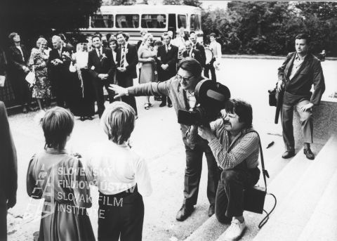 Vľavo vpopredí deti (otočené chrbtom), vzadu svadobčania, vpredu vpravo režisér Štefan Kamenický a kameraman Juraj Galvánek, za nimi stojí muž zo štábu (?).