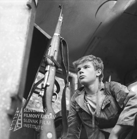 Negatív fotografie z filmu Pieseň o sivom holubovi (1961). Pavol Mattoš (Vinco)