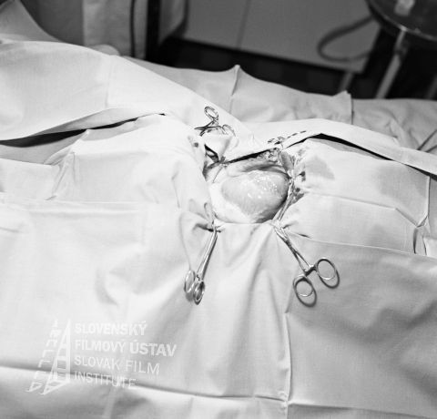 - Negatív fotografie z filmu: "...keby len tie dva roky!" (1973). Cez otvor v plachte vidieť operovaný orgán, okolo sú svorky.