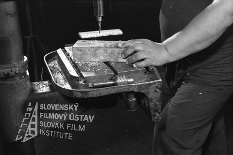 - Negatív fotografie z filmu: Chráň si ruky (1986). Vpravo je postava, ľavou rukou drží drevený hranol položený na železnom podklade. Nad hranolom je vŕtačka.