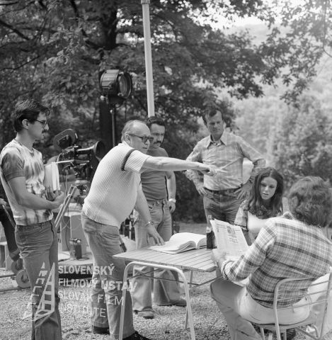 - Negatív fotografie z nakrúcania filmu Dievča z jazera (1978): režisér Ján Lacko (2. zľava), kameraman Vladimír Ješina (3. sprava), herečka Eva Hudečková a herec Jiří Štědroň (otočený chrbtom).