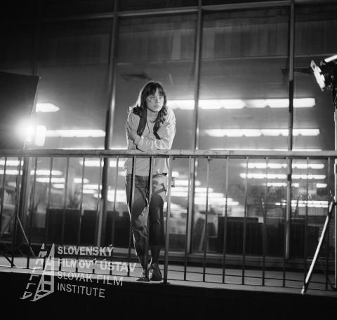 O zábradlie opretá Jana Svobodová v úlohe Maji Petrovej, okolo nej svetlá na stojanoch