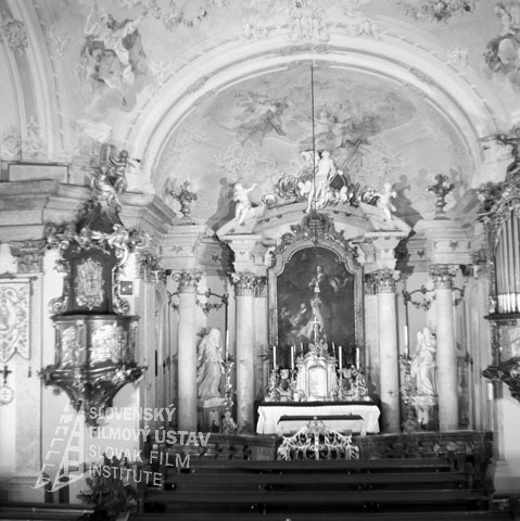 - Negatív fotografie z filmu: Pamiatky trenčianskeho okresu (1989). Interiér kostola. Dole sú lavice, v pozadí je oltár.