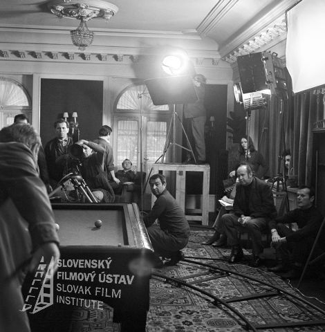 Negatív fotografie z nakrúcania filmu Páni sa zabávajú (1971): kameraman Vladimír Ješina (1. sprava), režisér Ján Lacko (2. sprava).