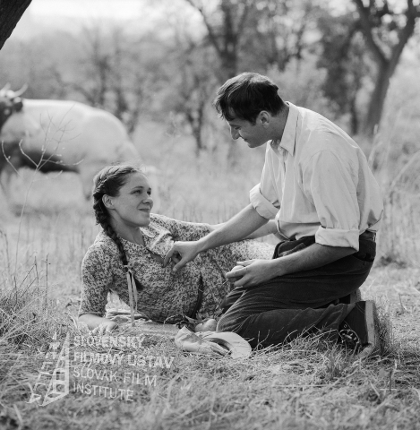 - Negatív fotografie z filmu Keď hviezdy boli červené (1990). Eva Salzmannová (Jelka) a Václav Koubek (Jozef Brezík).
