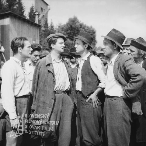 Negatív fotografie z filmu Priehrada (1950). Zľava doprava v popredí stoja: František Dibarbora (Fero), Július Pántik (Paľo Bučan, traktorista), Gustáv Valach (Jožo Bujna), Vladimír Durdík st. (Martin Bučan, predseda MNV), Ľudovít Jakubóczy (kostolník Bžoch) a Andrej Lettrich (muž v dave)