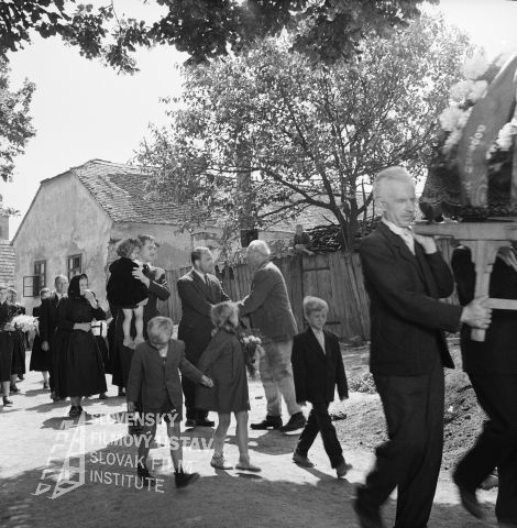 Negatív fotografie z filmu Čisté ruky (1956). Za tromi deťmi kráčajú: s dieťaťom v náručí Karol Machata (družstevník Jozef Grec), vedľa neho Andrej Lettrich (tajomník Okresného výboru KSS Čisarik), ktorý si práve podáva ruku s Rudolfom Bachletom (predseda družstva Rusiňko), vpredu nesie truhlu Peter Rúfus (družstevník Durkaj)