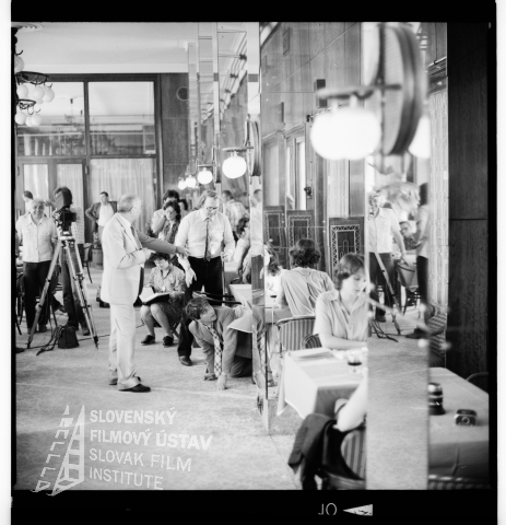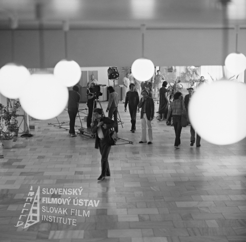 Negatív fotografie z nakrúcania filmu: Zbohom, sladké driemoty (1983). Pomocný režisér Július Jarábek (2. vpravo od kamery), režisér Vladimír Kavčiak (s okuliarmi).