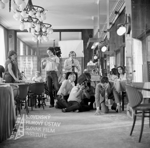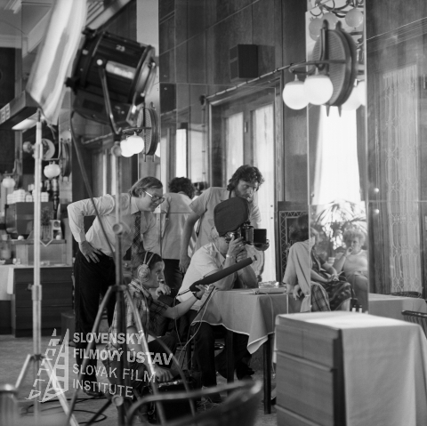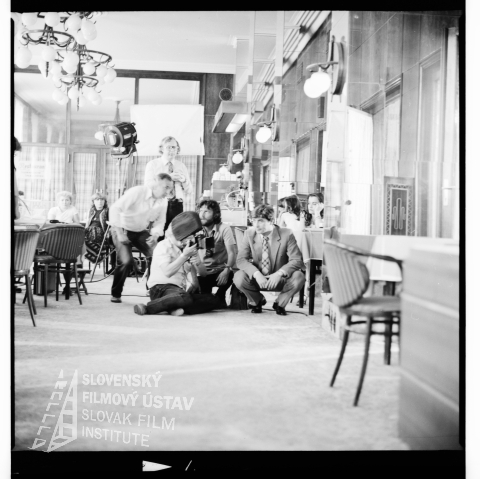 Negatív fotografie z nakrúcania filmu: Zbohom, sladké driemoty (1983). Kameraman Viktor Svoboda (1. zľava), herec Ivan Rajniak (v obleku, otočený bokom), režisér Vladimír Kavčiak (s okuliarmi), herec Vladimír Durdík (pod stolom).