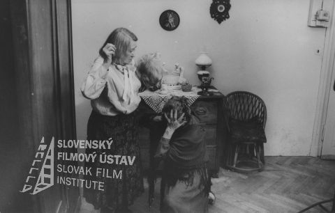 Zľava doprava: Jana Březinová (Bernátová, sestrička v domove dôchodcov), Ľudovít Greššo (Vengloš, vrátnik v domove dôchodcov), práve gratuluje a bozkáva Blanka Waleská (Juríková), práve prijíma pusu Vilém Pfeiffer (Fest, snúbenec Magdy Studenkovej), Mária Prechovská (Magda Studenková, Šimonina mama), a bokom stojí Marta Černická (Margarétka)