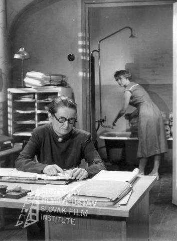 Fotografia z filmu Čert nespí (1956). V kancelárii v popredí za stolom sedí: Oľga Vronská (mzdová účtovníčka - stará panna), v pozadí nad vaňou sa skláňa Erika Bauerová (pisárka)