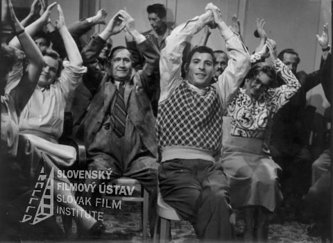 Fotografia z filmu Čert nespí (1956). V strede v popredí Jozef Sodoma (predseda ČSM Ivanič), vpravo Oľga Vronská (účtovníčka Pipulková), všetci sedia na stoličkách a s rukami zdvihnutými nad hlavou tlieskajú