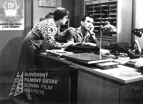 Fotografia z filmu Čert nespí (1956). V kancelárii: Oľga Vronská (účtovníčka Pipulková) sa skláňa pri stole, za ktorým zadumane sedí Ivan Krivosudský (účtovník Cyril Kvasnička), na stole je položený telefónny aparát a dve stolné lampy, vľavo na stene visí plagát s nápisom: ZŠP Budete viac vedieť a viac zarobíte