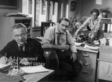 Fotografia z filmu Čert nespí (1956). V kancelárii za svojimi stolmi sedia: vpredu s cigaretou v ústach Eugen Senaj (účtovník Králik), v strede Branislav Koreň (účtovník Homola) a vzadu Oľga Vronská (účtovníčka Pipulková)