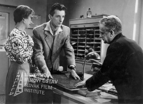 Fotografia z filmu Čert nespí (1956). V kancelárii pri stole stoja zľava doprava: Oľga Vronská (účtovníčka Pipulková), Ivan Krivosudský (účtovník Cyril Kvasnička) a Eugen Senaj (účtovník Králik)