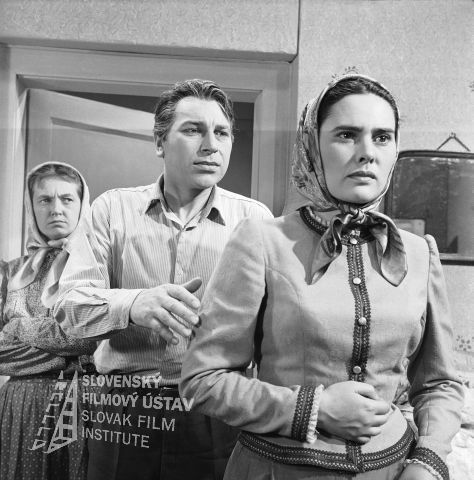 Negatív fotografie z filmu Čisté ruky (1956). Zľava doprava stoja: Oľga Vronská (Hana Vašková), Ctibor Filčík (Harman) a Jela Lukešová (Marička Harmanová)