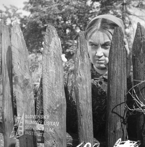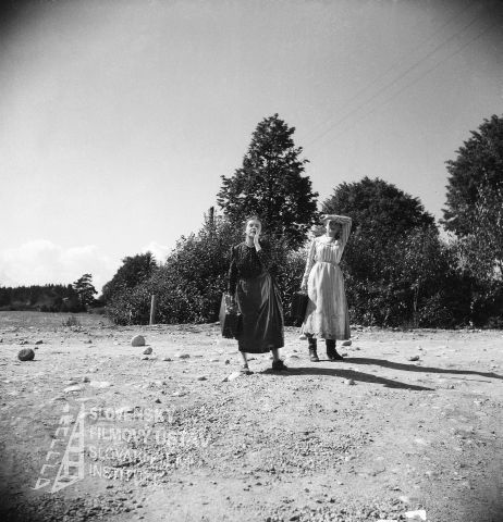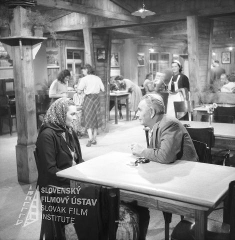 Negatív fotografie z filmu Lazy sa pohly (1952). V krčme v popredí za stolom sedia: Anna Marcineková (Božena) a Anton Tihelka (Matej Rendko), v pozadí vľavo stojí Ružena Struhárová (tancujúce dievča) a chrbtom stojí Oľga Vronská (tancujúce dievča).