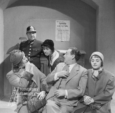 Negatív fotografie z filmu Statočný zlodej (1958). Zľava doprava sedia na stoličkách: Hana Meličková (predsedníčka spolku Humanitas), Martin Gregor (správca spolku Humanitas Rohatý) a Eva Krížiková (Vierka), Oľga Vronská (zatknutá prostitútka) vyplazuje Meličkovej jazyk, vzadu stojí policajt