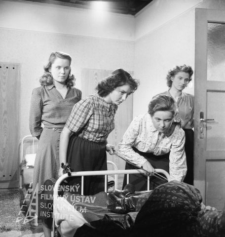 Negatív fotografie z filmu Katka (1949). Zľava doprava pri posteli stoja: Jolana Hollá-Mažáriová (Milka), Ružena Struhárová (Uľa), Oľga Vronská (Jolana) a pravdepodobne E. Kľúčiková (Dora Kľúčiková).