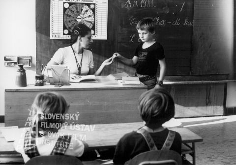 V školskej triede pri tabuli stojí Zuzana Kronerová (Jakubova učiteľka), vpravo stojí Henrich Hlocký (Jakub Kolárik), ostatné deti sedia v školských laviciach, na tabuli je napísané: 1. september vitajte v škole
