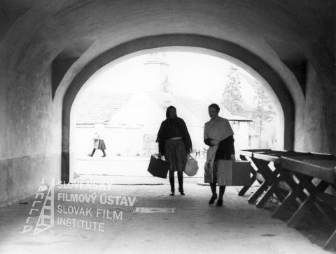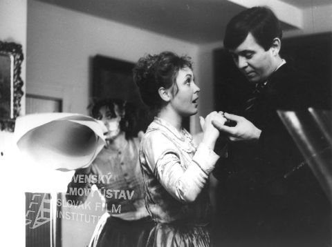 Vľavo stojí Zuzana Kronerová (Milka, slúžka u Rozvalidov), vpravo spolu tancujú: Naďa Konvalinková (Hanka Dubcová, slúžka u Rozvalidov, dcéra veľkostatkára Dubca) a Josef Abrhám (okresný komisár Ján Landík)