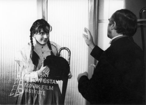 Vľavo v pozadí stojí Zuzuna Kronerová (Milky, slúžka u Rozvalidov), v strede stoja: Naďa Konvalinková (Hanka Dubcová, slúžka u Rozvalidov, dcéra veľkostatkára Dubca) a Josef Abrhám (okresný komisár Ján Landík)