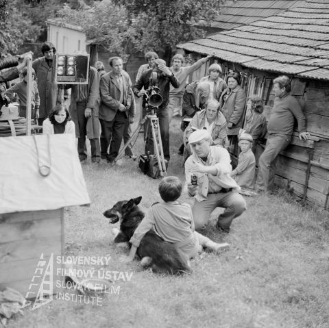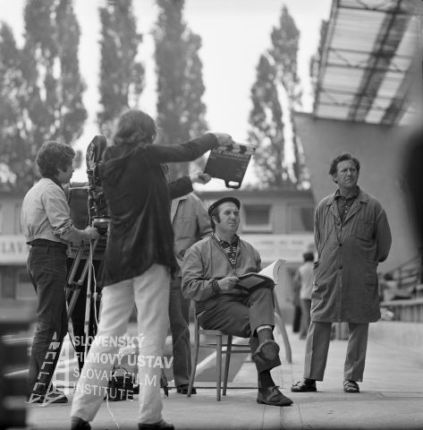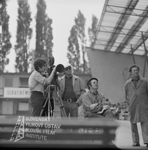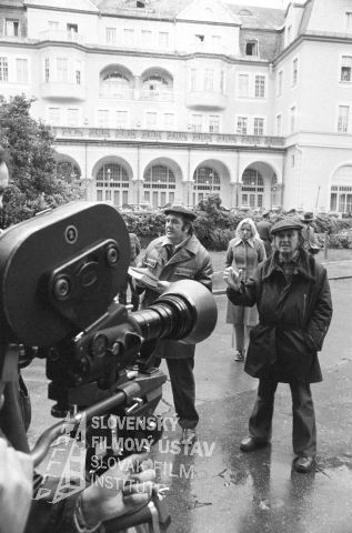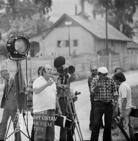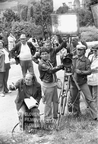 Negatív fotografie z nakrúcania filmu Pozor, ide Jozefína... (1976): režisér Jozef Režucha (sedí so scenárom), druhý režisér Alexander Bada (na ceste s klobúkom), asistent kamery Viktor Fančovič (pri kamere - 1. zľava), kameraman Stanislav Szomolányi (pri kamere - 1. sprava).