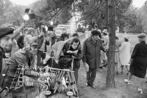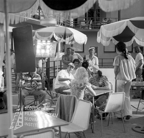 Negatív fotografie z nakrúcania filmu Pozor, ide Jozefína... (1976): zvukár Milan K. Némethy (1. zľava), režisér Jozef Režucha (2. zľava), asistent kamery Viktor Fančovič (sedí pri kamere - 1. zľava), druhý režisér Alexander Bada (úplne vzadu s čiapkou), kameraman Stanislav Szomolányi (stojí za kamerou, v čiapke), v popredí pri stole sedia herci Brigita Hausnerová-Sitárová (otočená chrbtom) a Jiří Hrzán.