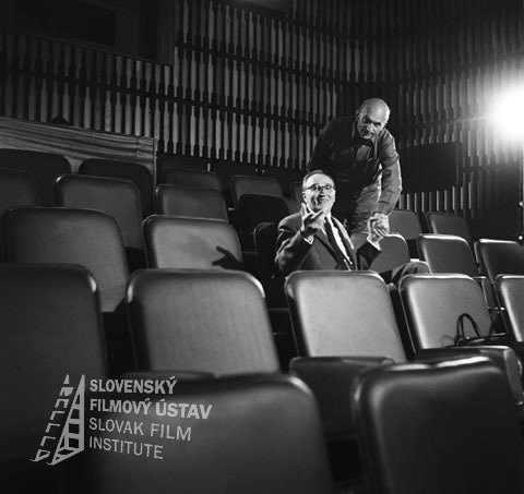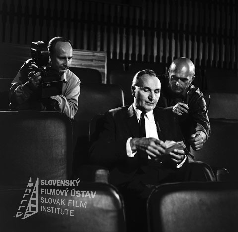 Negatív fotografie z nakrúcania filmu: Paľo Bielik (1971). Mierny podhľad. V miestnosti sedí na sklápacej stoličke Paľo Bielik. Vľavo za ním stojí muž s kamerou v rukách, vpravo sa Vojtech Andreánsky skláňa k Bielikovi.