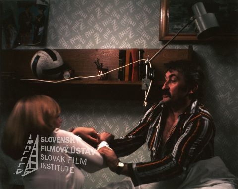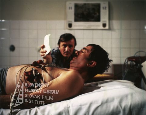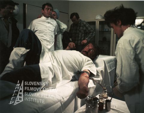 V ambulancii zľava doprava: Július Pántik v úlohe Ďura Hrončeka, Jan Tříska v úlohe Maťa Pompuru (stojí v bielom plášti), vpredu na posteli leží Pavel Landovský v úlohe Milana Papieža a vzadu stojí Radoslav Brzobohatý v úlohe vedúceho brigády Ivana Kuníka.