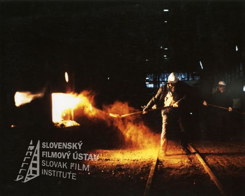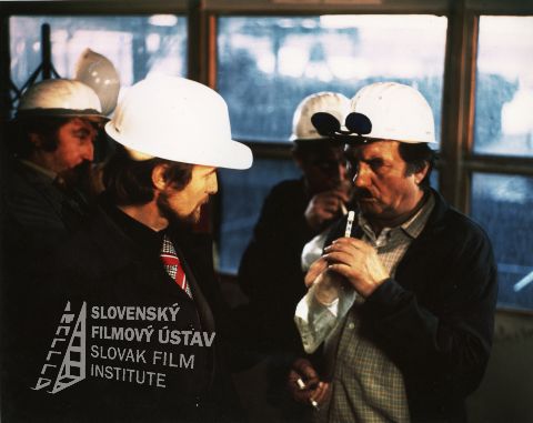 Vľavo stojí Pavel Landovský (Milan Papiež), vpravo stojí Július Pántik (Ďuro Hronček), za ním stojí Jan Tříska (Maťo Pompura), muž v popredí v strede (?), všetci muži majú na hlavách biele helmy.