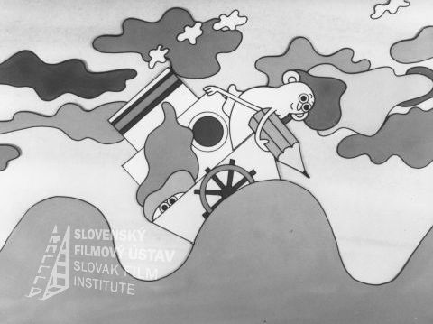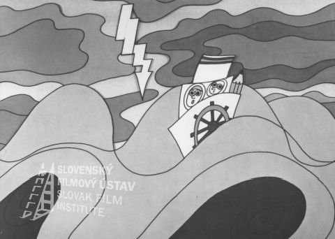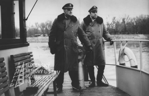 Dvaja muži stoja pri zábradlí na palube lodi, na sebe majú kabáty a námornícke čiapky, vľavo sú dve lavičky, vpravo je zavesené záchranné koleso, v pozadí vidno stromy